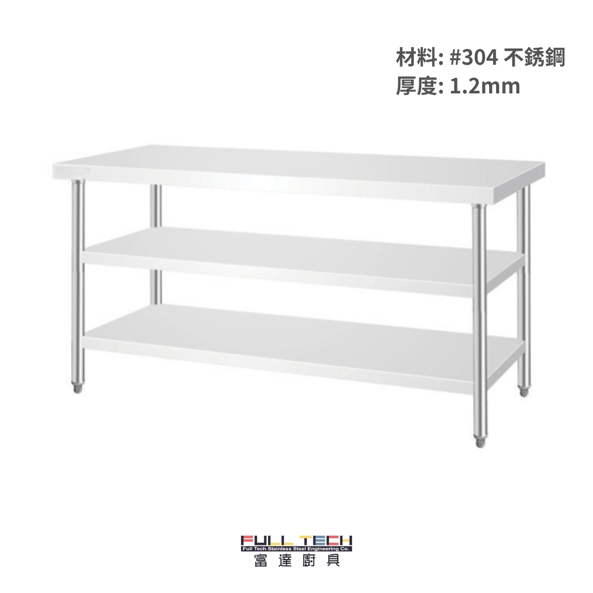 不銹鋼三層工作台是需要大量枱上儲物空間的商用廚房理想選擇,採用 304 不銹鋼 及 1.2mm 厚身台面 製造,配合四腳圓管腳架及 雙層下層層板,兼顧穩固性與儲物功能。上層台面可用作切菜、分盤或擺放設備,下兩層層板則可存放盤碟、食材膠箱及雜物,有效釋放地面及枱面空間,令後場工作區更整齊高效。多款標準尺寸可選,如需特別尺寸或配合設備開孔,均可提供度身訂造服務。